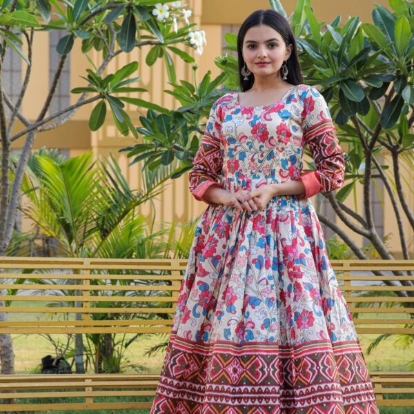 Kalamkari Designed Silk Gown with Jacquard Weaving Work, It looks Amazed for women, it Designed to flatter all body types, gowns for women combine the best parts of western and Indian wear into one stunning ensemble.
